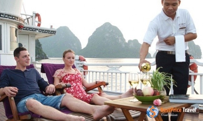 What can be more relaxing for you and your beloved one than taking a sip of wine imported from a far away land, or lazily lying on a cozy lounge chair at Bhaya Legend I’s sundeck? This is when you are surrounded by the convenient facilities of the cruise’s bar area or the peaceful ambience of the ocean.