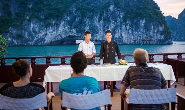 Cruising on Dragon Legend, visitors will be immersed in Vietnamese ancient atmosphere through several outstanding Vietnamese cultural symbols onboard. From the outside decoration to the inside facilities and accommodation onboard, they are all totally new and shiny items. Moreover, the decoration on board is a mix of Vietnamese cultural details, so you can immerse yourself to a little traditional Vietnam with Chu Dau Ceramics, Red Dao brocade, copper lotus flowers, Hung Kings symbols, etc. Do you want to know why our Dragon Legend use all cups, teapots, dishes, bowls and flower pots from Chu Dau Ceramics? Do you know the meaning of decorations in your cabin with water puppets and unique brocades? Have you ever wondered why we set up the corridor on boat like a museum of Vietnamese cultures? Besides spoon and fork, do you know clearly how to use chopsticks – a very Asian and popular in Vietnamese family meals? Let’s come with us to find out your own answers. Dragon Legend modern luxury cruiser is truly a showcase of Vietnamese culture and design. All of the handmade decorations were gathered from different regions of Vietnam and reflect the beauty and excellent craftsmanship of traditional works of art. Throughout the cruise, Vietnamese legends and cultural values are introduced to augment guest’s knowledge and appreciation of our fascinating culture.