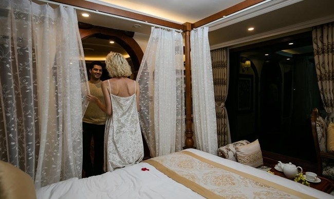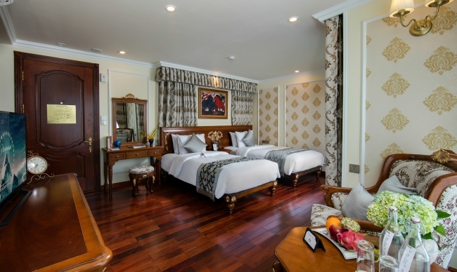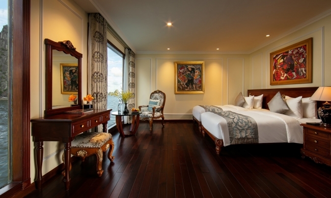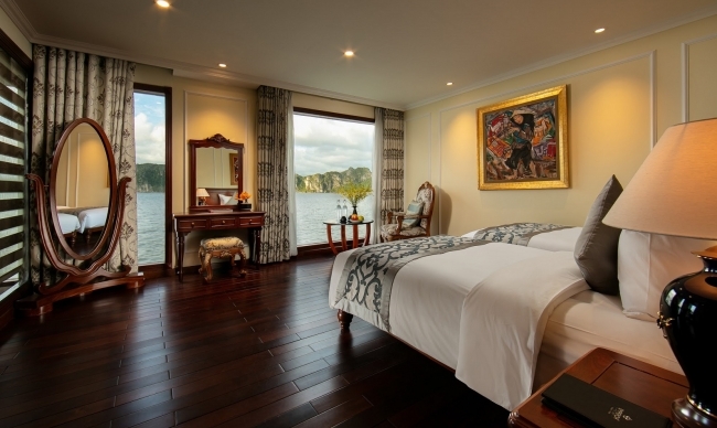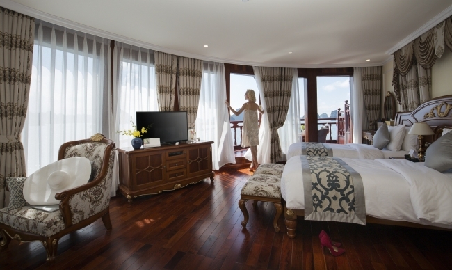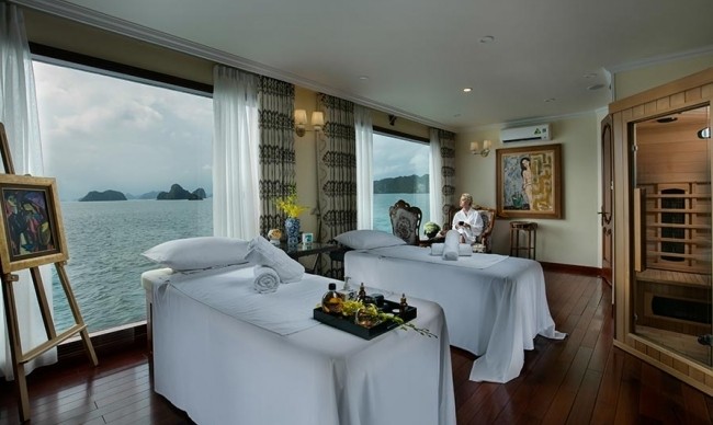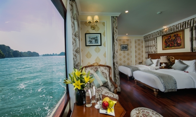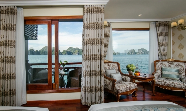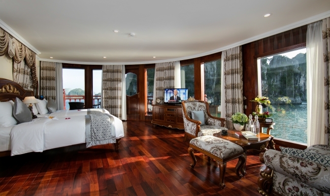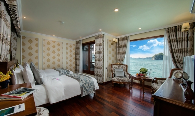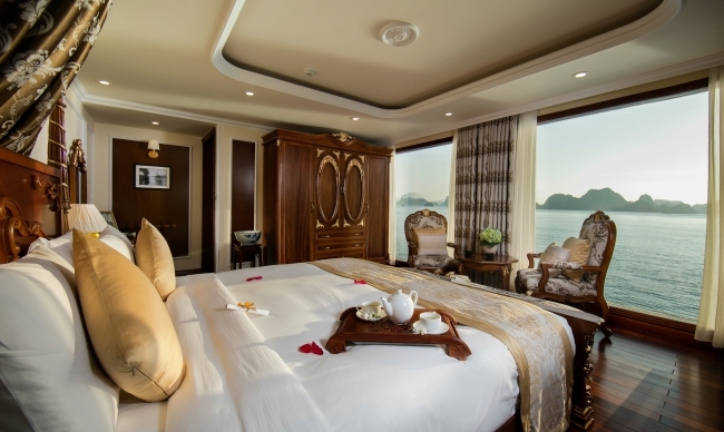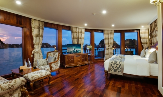 Being the most boutique, luxurious, sophisticated & unique designed cruise in Ha Long bay, Emperor Cruise highlights itself with 8 ensuite cabins equipped with full ocean view, private balconies, butlers on board, and limousine services to and from the port. All the boat likes a small Vietnam country with 8 suites named 8 villas of the Emperor Bao Dai through out all regions of Vietnam. Besides 8 suites, there are Gym, Spa & Massage, Open bars & lounges, Bistro- bar & cinema, library, kids’ club and huge restaurant.