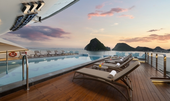 Situated on the 2nd deck of Grand Pioneers Cruise, the salt water infinity pool appears to blend to the ocean waters beyond with wonderful views of Halong Bay and thousand stars in the sky at night. Nothing compares to dipping in cool water and loosening your muscles after a long day of activity in Halong Bay. If you want to keep your toes dry, just pull up a chair at the Pool Bar and relax with a refreshing drink like the Royal Citrus Ritatini or the Smokey Rita.