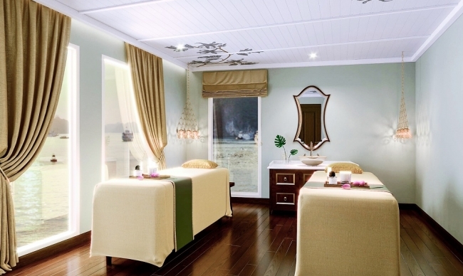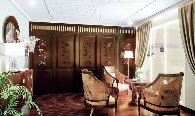 Designed meticulously in elegant Indochine style with dark wood and rattan furniture, Ylang’s restaurant & bar offers passengers a pleasant Vietnamese culinary dining experience in a cozy and luxury ambiance. You can also enjoy time here for perfect day and nighttime views of the bay through surrounded glass windows. Our bartender will surely give you some best drinks.