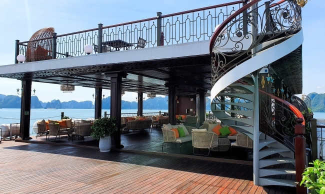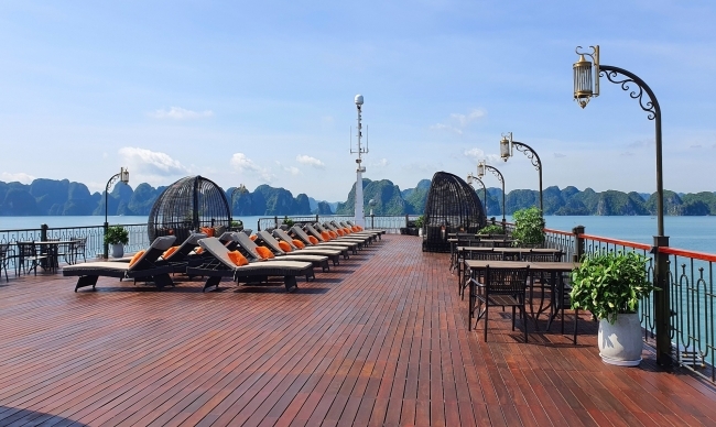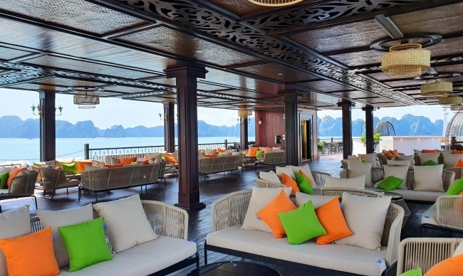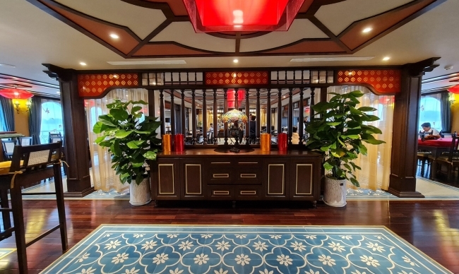 The onboard Tonkin restaurant is run by experienced chefs serving à la carte and set menus. You will have a chance to savor a varied selection of Vietnamese and international cuisines in an elegant decorated space that much evokes a vintage colonial past with antiques and art galleries.