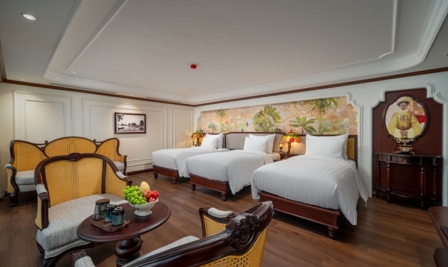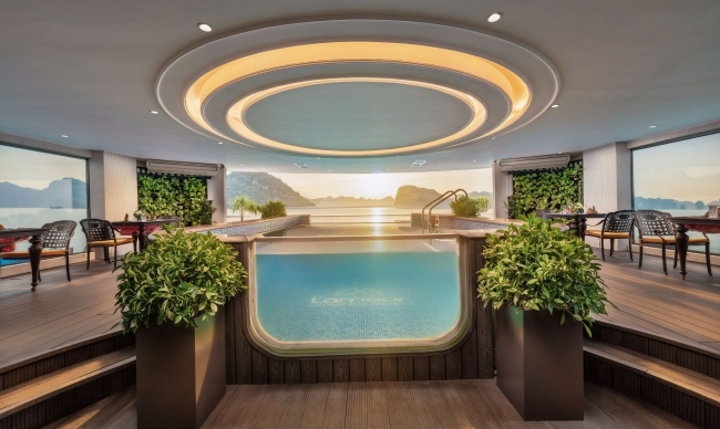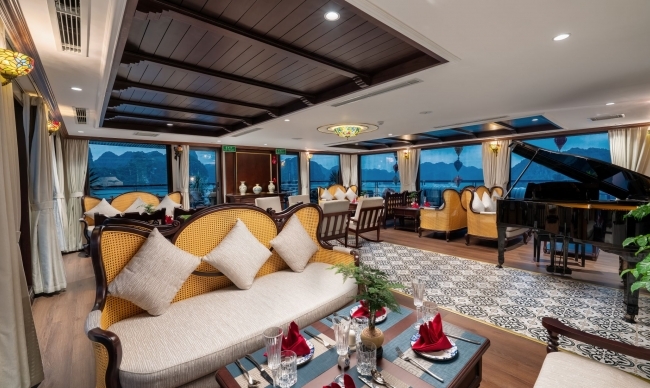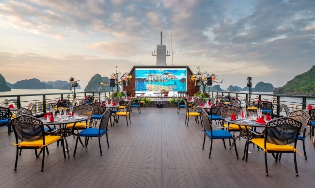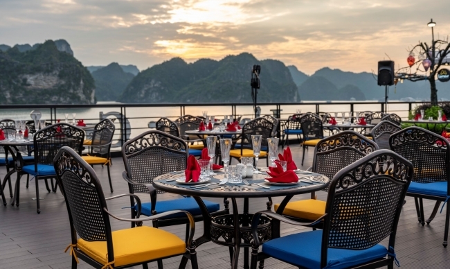 Thăng Long, the iconic symbol of the thousand-year-old capital of Hanoi, was chosen as the name for the L'amour cruise's sundeck, representing the desire for a wealthy, thriving, and long-lasting future. This space is the perfect spot where passengers can enjoy daytime activities such as viewing the dawn, practicing traditional Vovinam martial arts, having an afternoon tea party, or taking gorgeous photos. At night, the Thang Long sundeck changes into a romantic, open-air restaurant adorned with sparkling lights, providing a magnificent setting for a memorable dining experience.