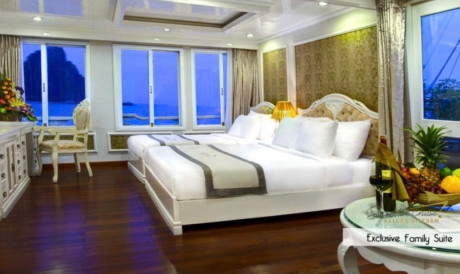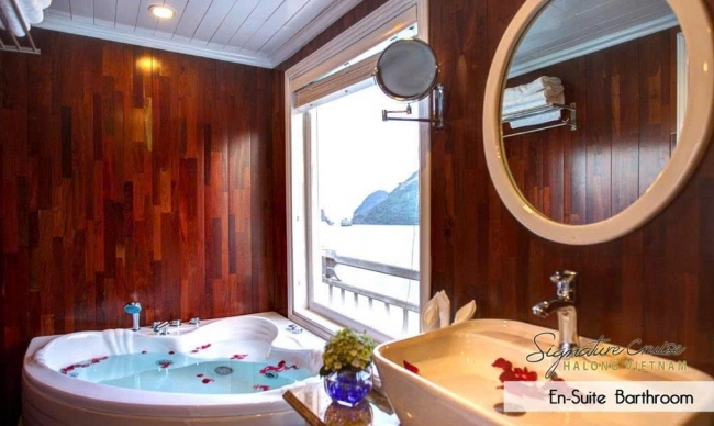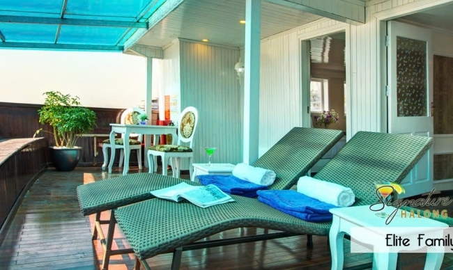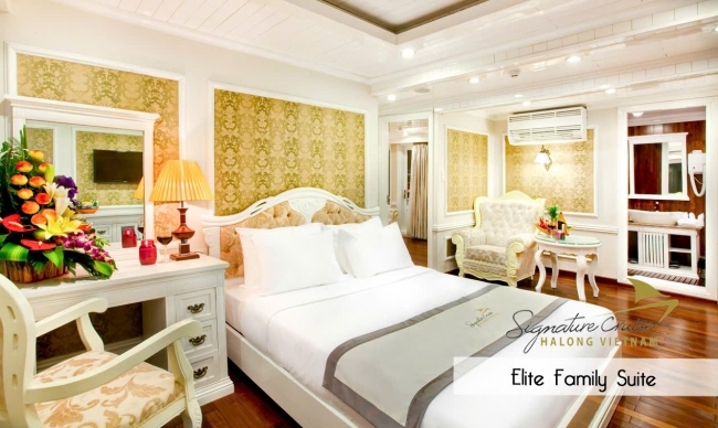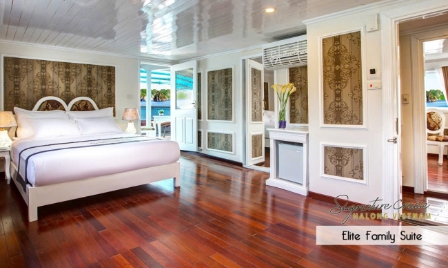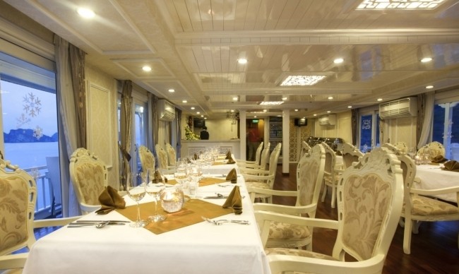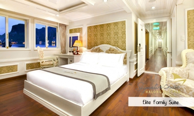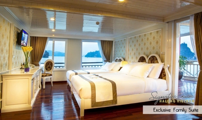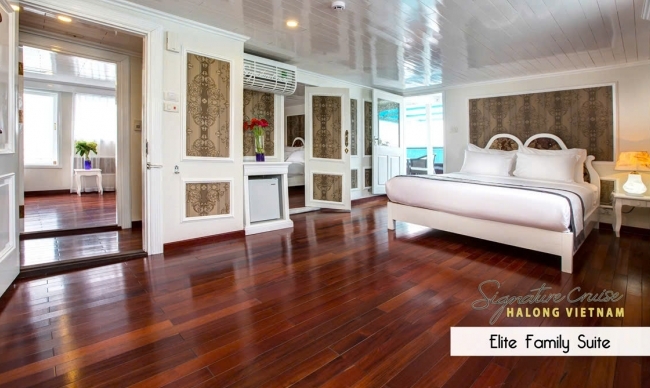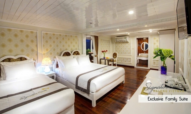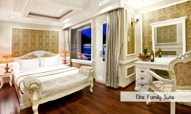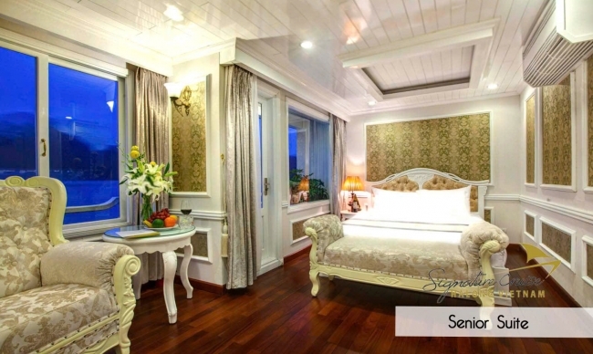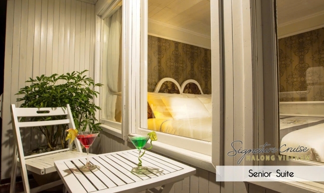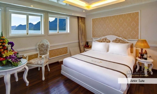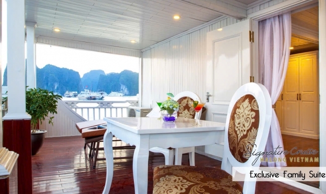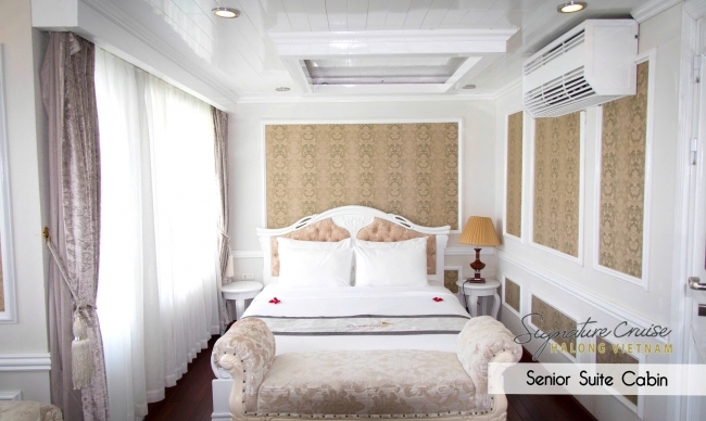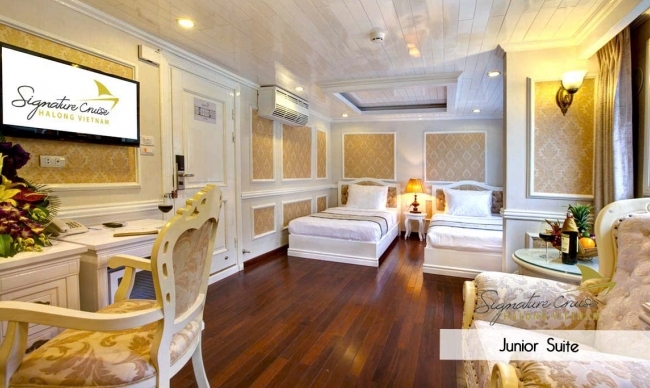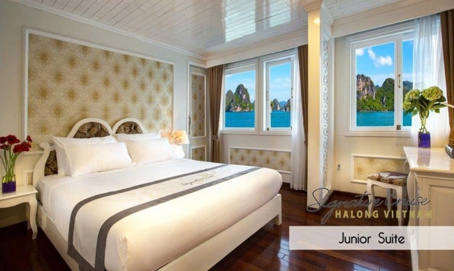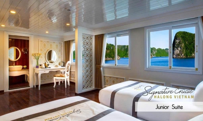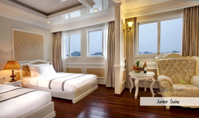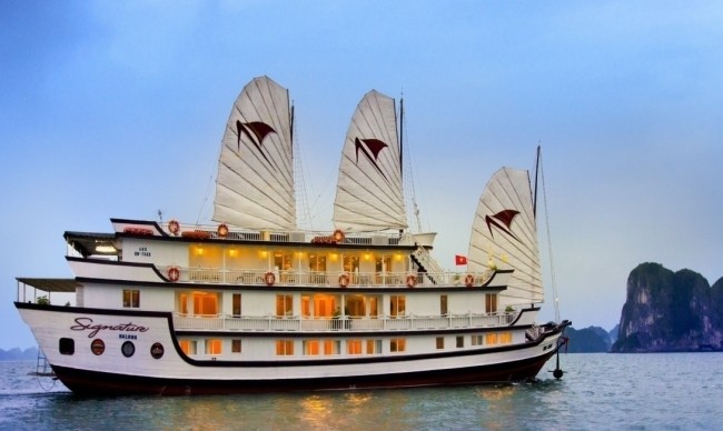 Situated in a traditional boat and inspired by French décor, Signature Cruise has been one of the largest ships in the area and also among the most sought vessels on the Gulf of Tonkin. Housing 16 spacious and luxury cabins with the elegant white color theme, Signature Cruise looks like an amazing floating hotel amid the blue waters of Halong Bay – Bai Tu Long Bay. With customized itineraries, modern facilities and professional services, this 5-star cruise ship will bring to passengers unique cruising excursions and truly unforgettable experience in the famous World Heritage Site.