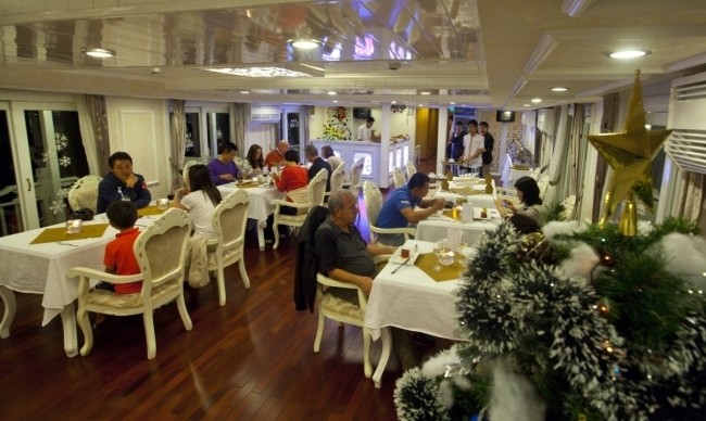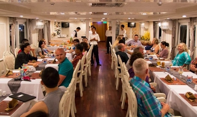 After a whole day of traveling, you may want to relax for drinking or participating in many exciting activities on board: enjoying film entertainment, board games, trivia quizzes or trying your luck with squid fishing. You even can simply contemplate the beauty of Halong at night on the deck.
