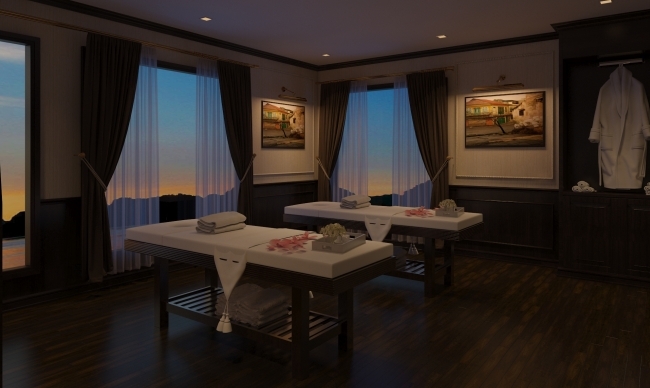 Tulip Cruise combines luxury with leisure through a series of modern onboard facilities designed for relaxation and enjoyment. Guests can unwind in the outdoor swimming pool, stay active at the well-equipped gym, or enjoy a soothing treatment at the spa. For added fun, there’s a mini golf course and a Sky Bar on the sundeck, perfect for sipping cocktails while taking in panoramic views of Lan Ha Bay.
